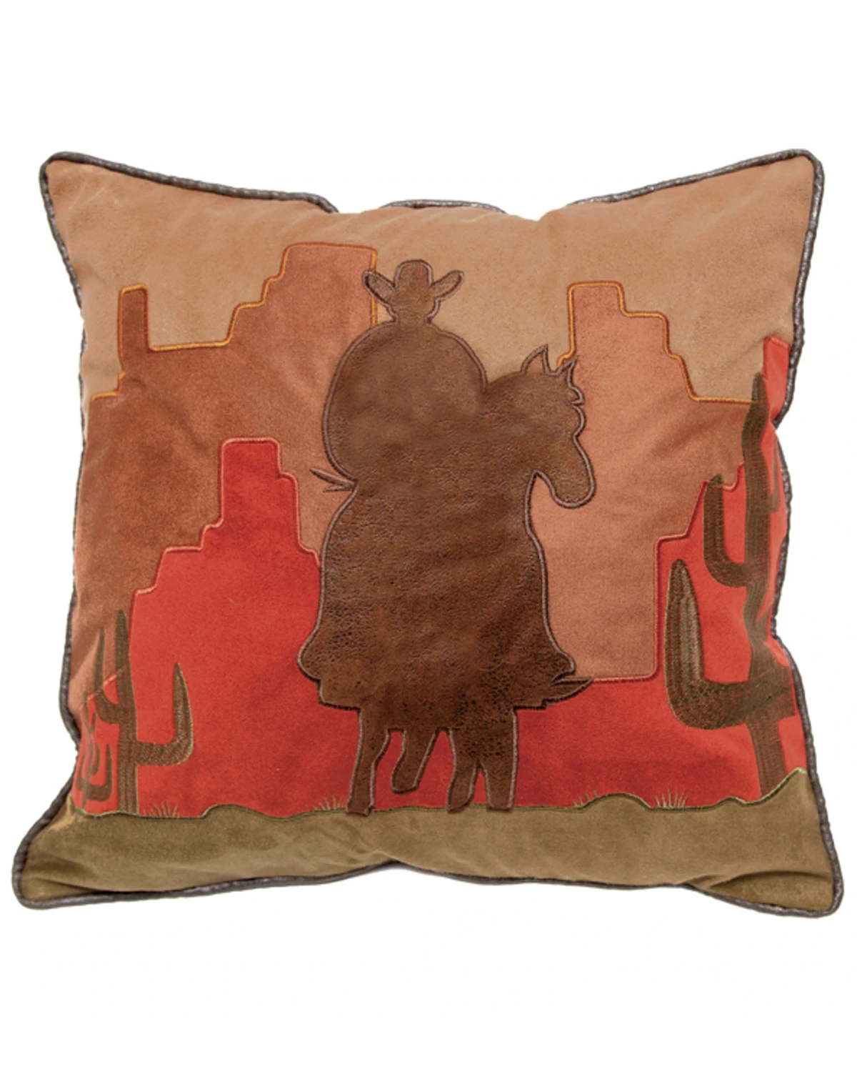 - Brown suede cowboy silhouette with orange desert scene