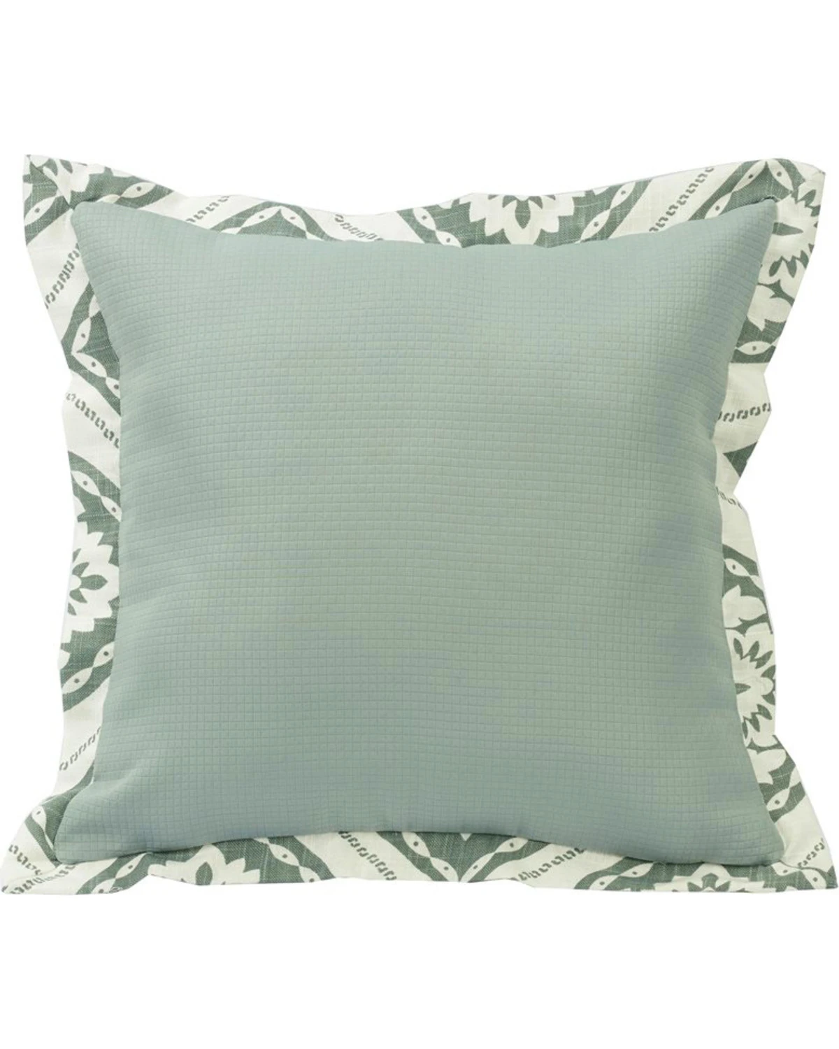 This textured fabric pillow by HiEnd Accents features a beautiful green color with a graphic print flange. Measures 18X18″.