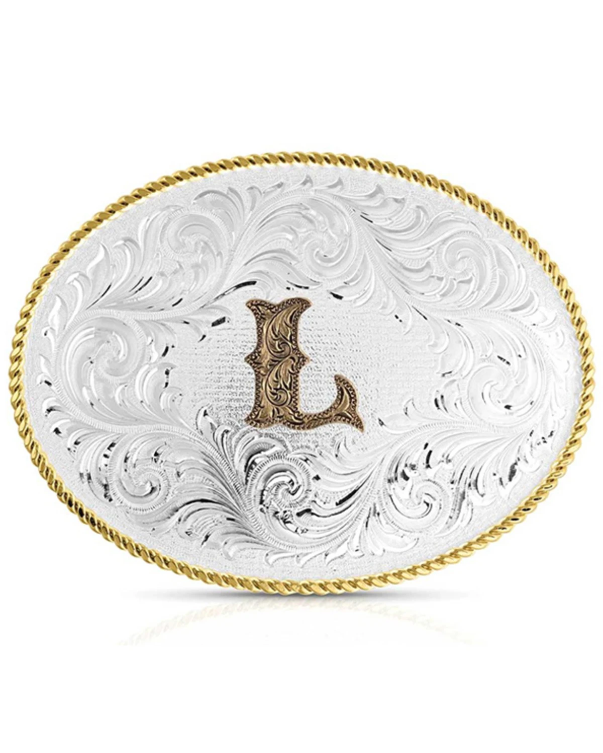 - Silver-toned oval buckle with gold roped border and “L” on front with silver-toned filigree details