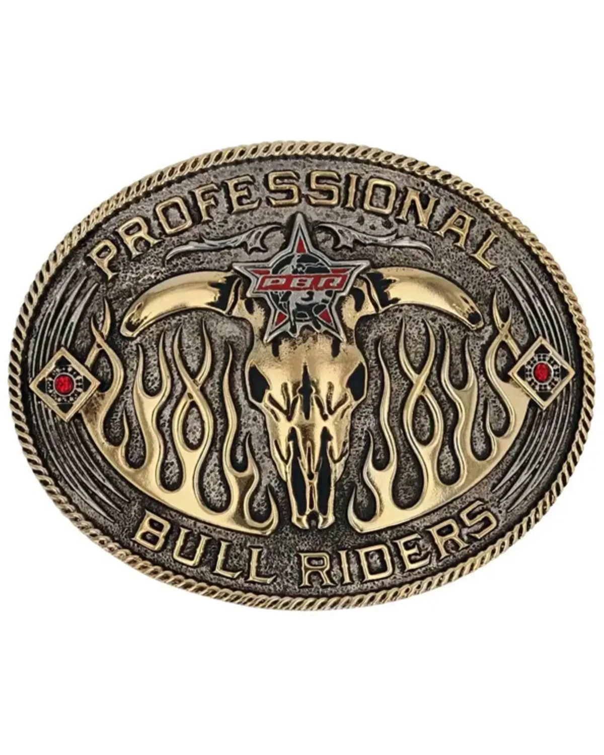 - Steer head skull with open flames and “Professional Bull Riders” design