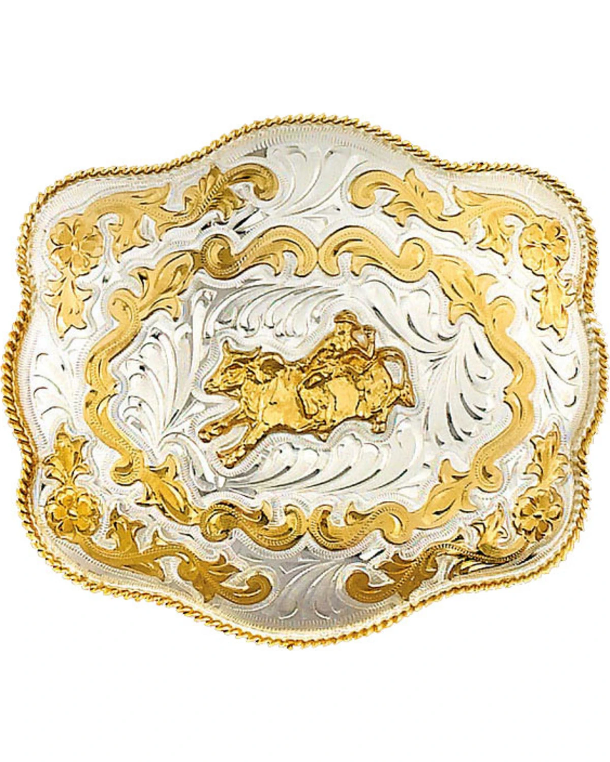 Get ready for the next rodeo coming to town when you pull on this belt buckle from Western Express. This buckle is adorned with a gold finish and features a bullrider in the center. The gold trim along the scalloped edges will look great with any belt in your closet. Saddle up and get ready for the ride of your life when you wear this belt buckle from Western Express.